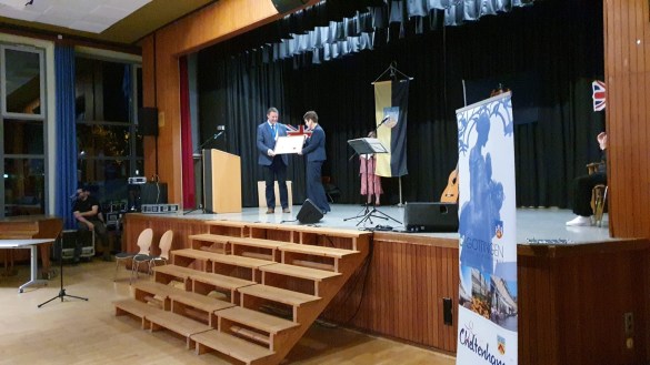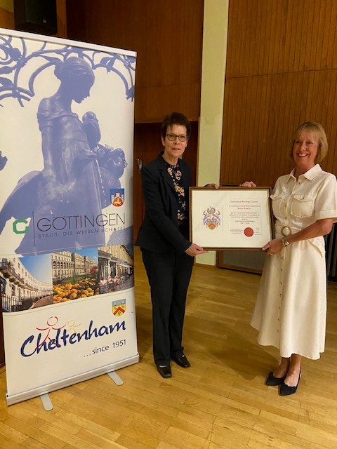The Mayor of Cheltenham, Cllr Matt Babbage, presented Karin Ropeter with the framed citation during the Official Reception held in Göttingen on Sunday 24 September as part of the welcome for the group of 40 citizens from Cheltenham. Many Göttingen supporters of twinning were also present.